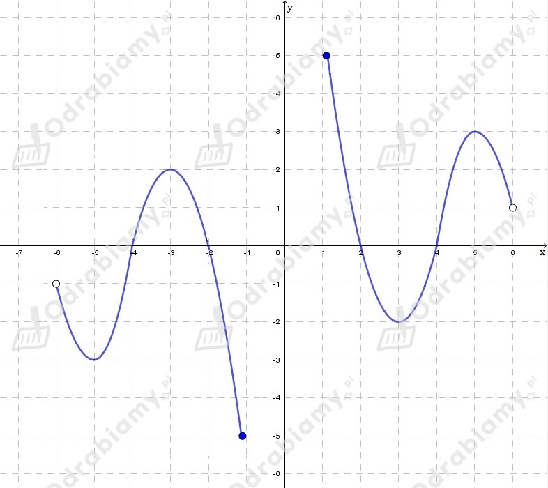 c) Przedziały, w których funkcja jest malejąca: (-6,-5>, <-3,-1>, <1,3>, <5,6)