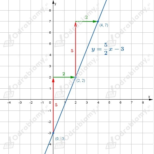 Wynika stąd, że jeżeli do wykresu funkcji należy punkt (0, -3), to do wykresu należą też punkty (0+2, -3+5)=(2, 2), (2+2, 2+5)=(4, 7), itd.