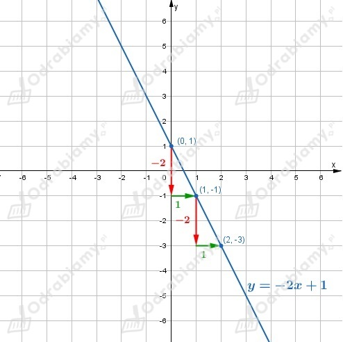 Wynika stąd, że jeżeli do wykresu funkcji należy punkt (0, 1), to do wykresu należą też punkty (0+1, 1-2)=(1, -1), (1+1, -1-2)=(2, -3), itd.