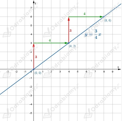 Wynika stąd, że jeżeli do wykresu funkcji należy punkt (0, 0), to do wykresu należą też punkty (0+4, 0+3)=(4, 3), (4+4, 3+3)=(8, 6), itd.