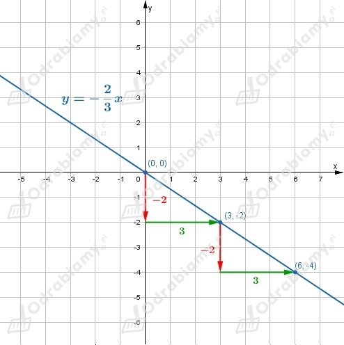 Wynika stąd, że jeżeli do wykresu funkcji należy punkt (0, 0), to do wykresu należą też punkty (0+3, 0-2)=(3, -2), (3+3, -2-2)=(6, -4), itd.