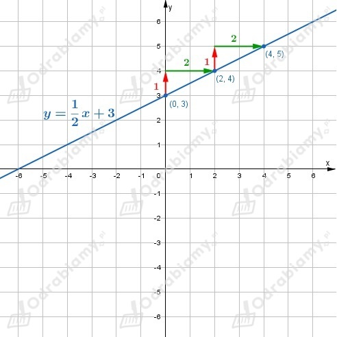 Wynika stąd, że jeżeli do wykresu funkcji należy punkt (0, 3), to do wykresu należą też punkty (0+2, 3+1)=(2, 4), (2+2, 4+1)=(4, 5), itd.