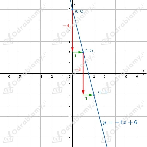 Wynika stąd, że jeżeli do wykresu funkcji należy punkt (0, 6), to do wykresu należą też punkty (0+1, 6-4)=(1, 2), (1+1, 2-4)=(2, -2), itd.
