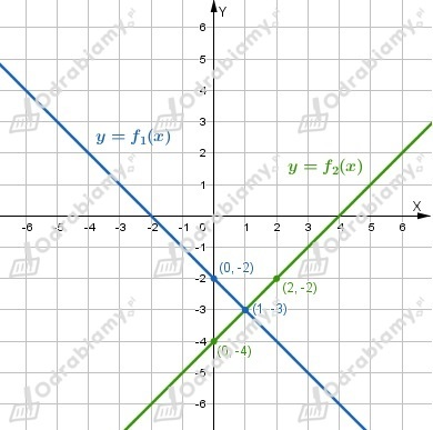 Wykres funkcji f1 przechodzi przez punkty (0, -2), (2, 0).