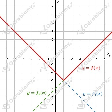 Wykres funkcji f jest sumą wykresu funkcji f1 w przedziale (-oo, 1) i wykresu funkcji f2 w przedziale <1, +oo).