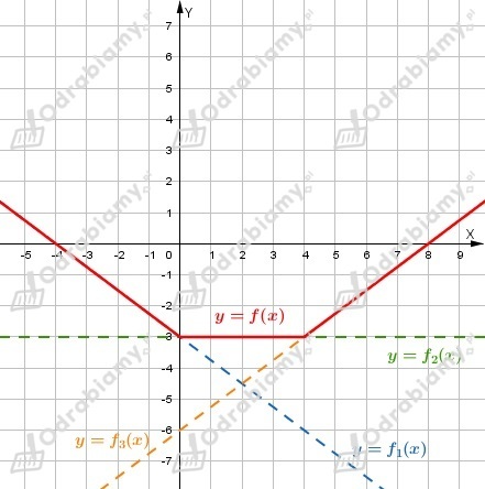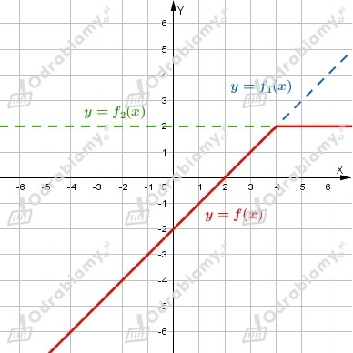 Wykres funkcji f jest sumą wykresu funkcji f1 w przedziale (-oo, 4) i wykresu funkcji f2 w przedziale <4, +oo).