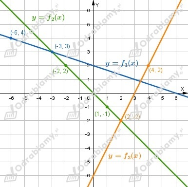 Wykres funkcji f1 przechodzi przez punkty (-6, 4), (-3, 3).