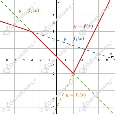 Wykres funkcji f jest sumą wykresu funkcji f1 w przedziale (-oo, -3), wykresu funkcji f2 w przedziale <-3, 2> i wykresu funkcji f3 w przedziale (2, +oo).