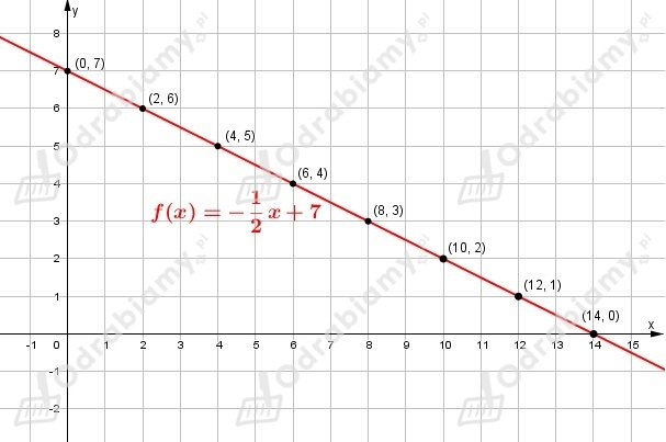 Z wykresu odczytujemy punkty, których obie współrzędne są liczbami naturalnymi: (0, 7), (2, 6), (4, 5), (6, 4), (8, 3), (10, 2), (12, 1), (14, 0).